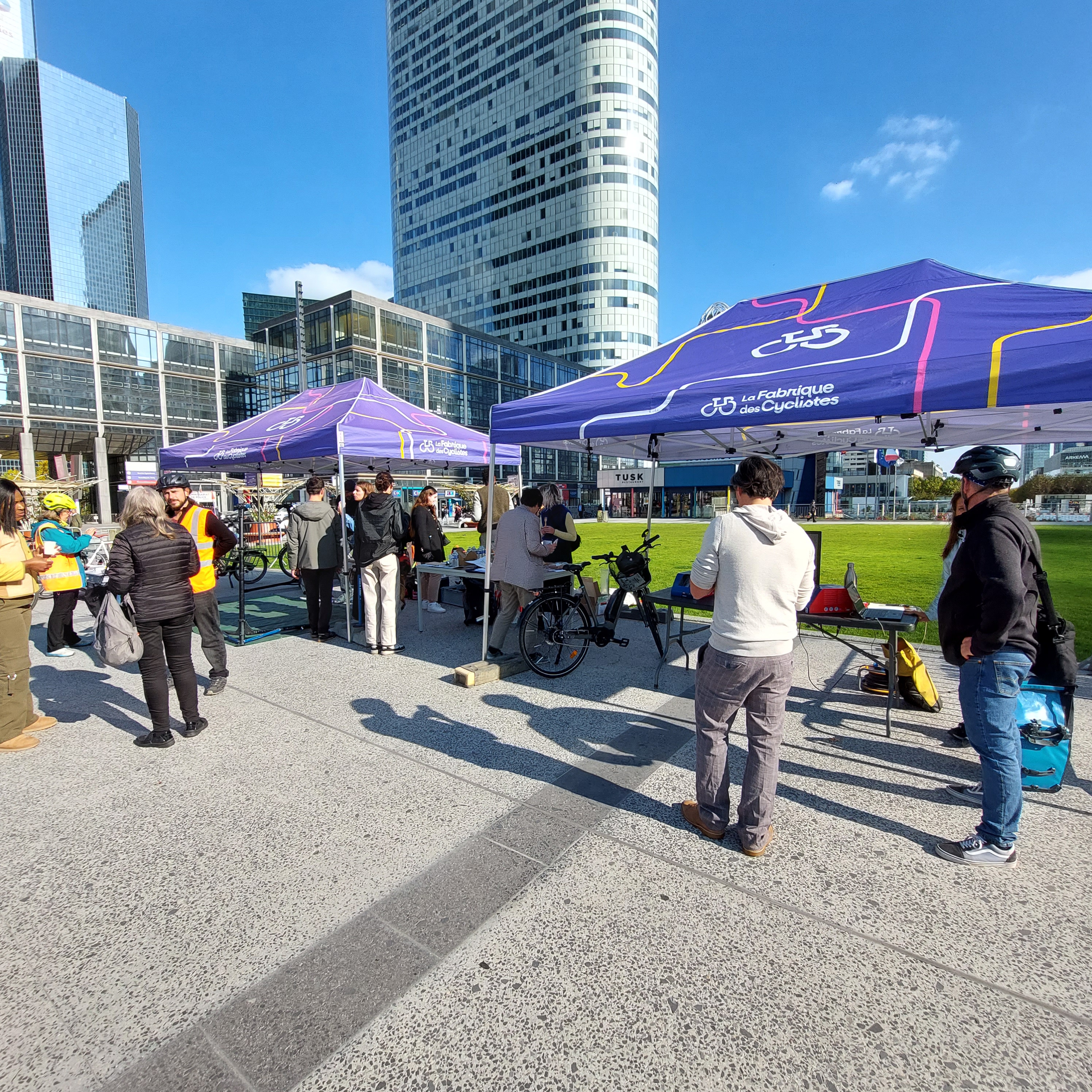 L’établissement Paris La Défense en collaboration avec le territoire Paris Ouest La Défense ont organisé le 14 octobre dernier une animation consacrée aux mobilités douces sur le parvis: stand de réparation vélo, quizz, balades découverte des accès vélo à la dalle, projection-débat ont attirés de nombreux visiteurs. Le plan des accès et stationnements dédiés aux vélos sont consultables sur le site ici.