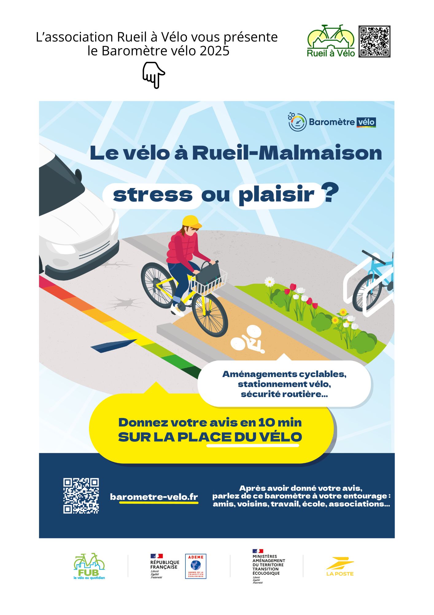 Bonjour X. Je viens de remplir ce baromètre vélo, qui est une enquête nationale permettant d’évaluer les conditions de circulation à vélo dans chaque commune (ce qui a été amélioré / ce qui reste à l’être), et va aider à guider les politiques publiques sur les aménagements à venir. On a besoin d’un maximum de réponses pour la commune de Rueil-Malmaison. https://www.barometre-velo.fr/. Et n’hésite pas à faire suivre à d’autres personnes. Un grand merci par avance